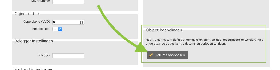 Echter, wanneer deze huurder nog geen (concept) facturen heeft dan kunt u de situatie aanpassen middels de actie 'Datums aanpassen' te vinden bij de 'Object koppelingen' wanneer u de objectgegevens van een bestaand of nieuw object bewerkt, zie tevens onderstaande afbeelding ter toelichting.