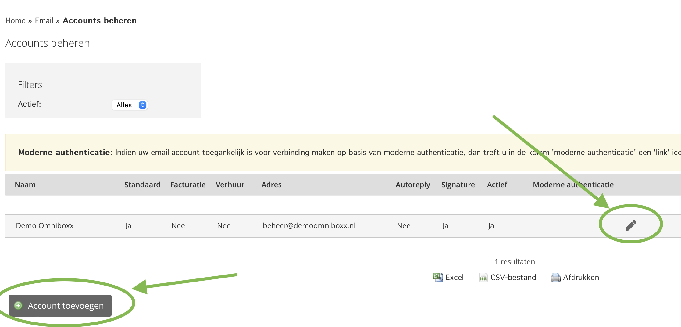 Standaard is er een (voorbeeld) account aanwezig genaamd "Omniboxx (Standaard)"