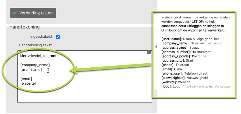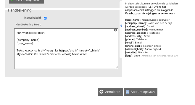 Handtekening tekst: Invoerveld voor de gewenste handtekening, verschillende variabelen kunnen hier toegepast worden.