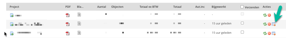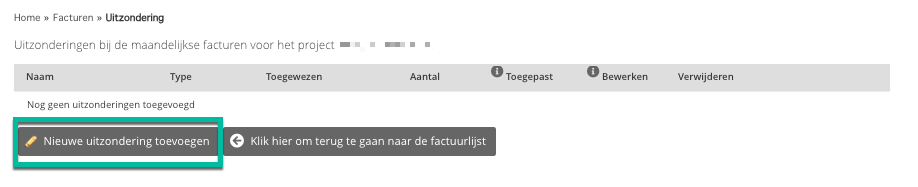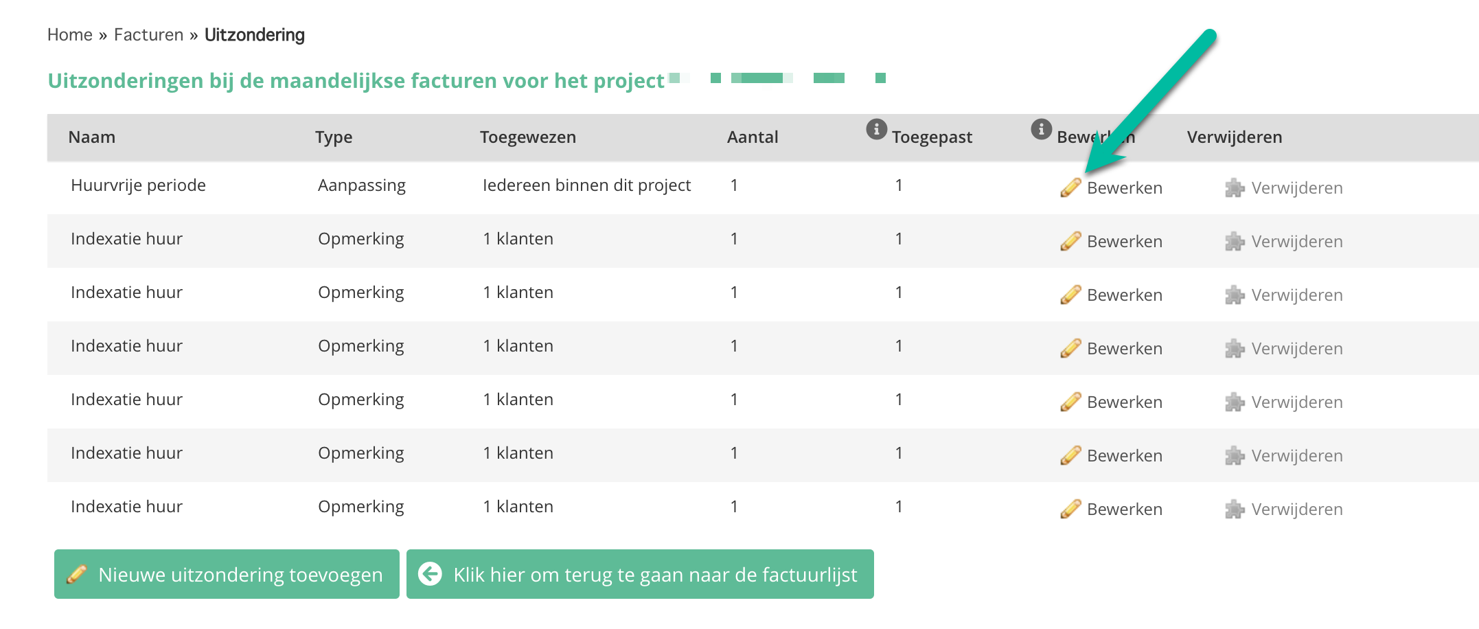 Er opent een scherm met alle eerder aangemaakte uitzonderingen voor dit betreffende project. Door middel van het potloodje kunnen de details worden ingezien en/of kan de uitzondering worden bewerkt.