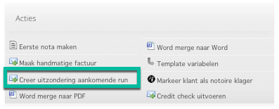 De functionaliteit "Creëer uitzondering aankomende run" is ook te benaderen via de huurderspagina, in het kader "Acties".