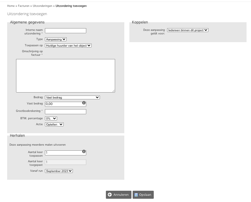 Voor dit soort (tijdelijke) aanpassingen is er binnen Omniboxx de functionaliteit om een uitzondering op de aankomende run door te voeren. Met een uitzondering kan een bepaald bedrag dat voor één of meerdere perioden in de maandelijkse factuur opgeteld of afgetrokken moet, verwerkt worden.