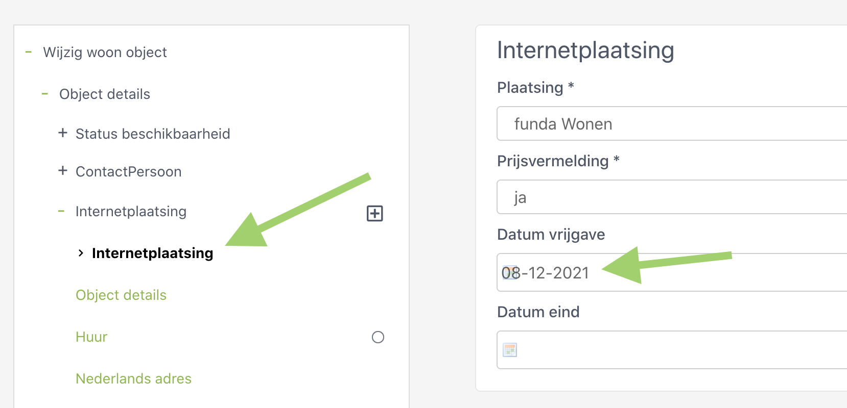 Kijk of er een (actuele) datum internetplaatsing aanwezig is, zo niet vul deze dan in bij internetplaatsing.