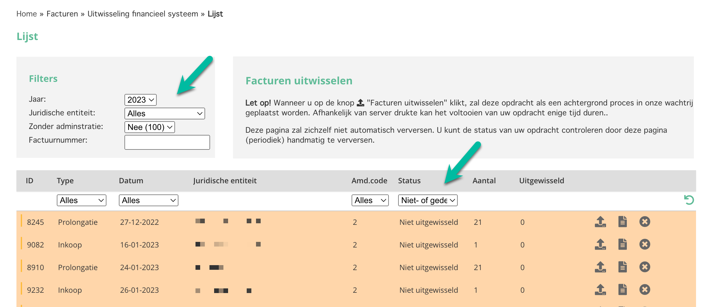 Om te zien of er facturen niet zijn uitgewisseld is het aan te raden voor het filter "status" te kiezen voor "niet uitgewisseld", Niet- of gedeeltelijk uitgewisseld" of "Gedeeltelijk".