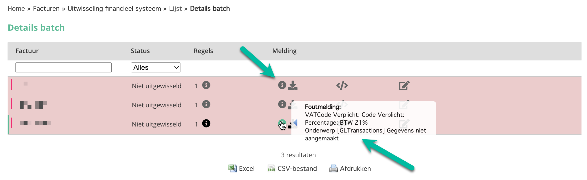 Klik om te controleren of het financiële pakket een foutcode heeft terug gegeven op het icoon van het formulier (facturenlijst weergeven):