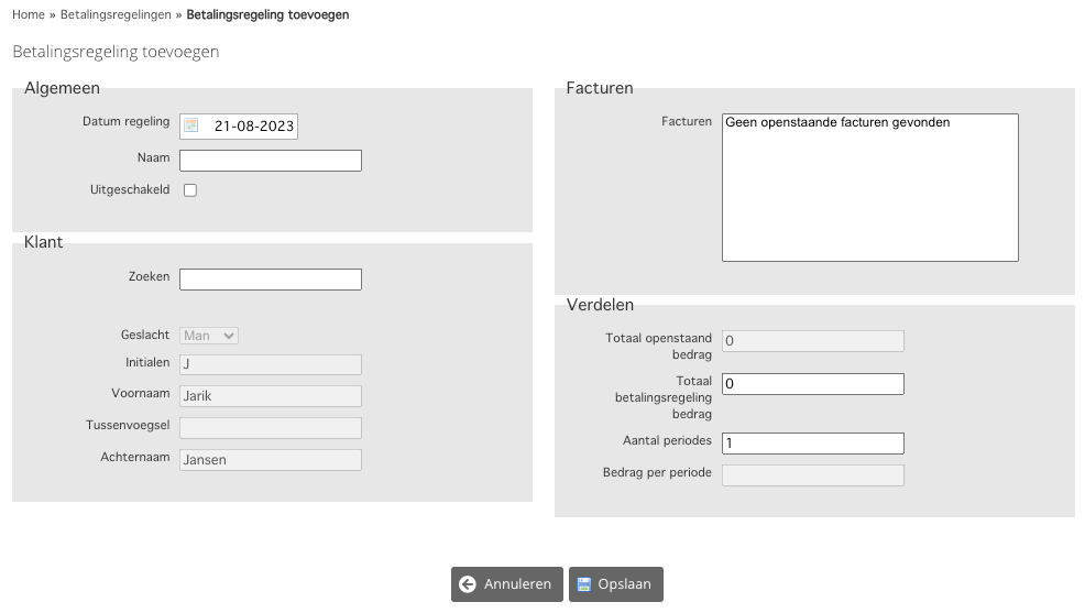 Totaal openstaand bedrag: Na selectie van facturen waar de regeling betrekking op heeft komt hier een totaal openstaand bedrag te staan.