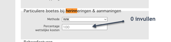 als je hier een 0 invult bij bij het percentage kosten dat in rekening gebracht wordt, zullen er geen boetes worden berekend.