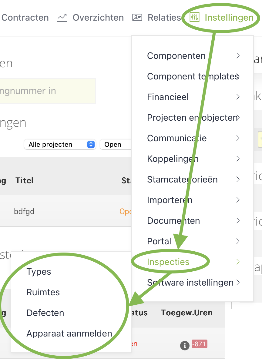Ga hiervoor naar: “Instellingen -> Inspecties -> Defecten”.