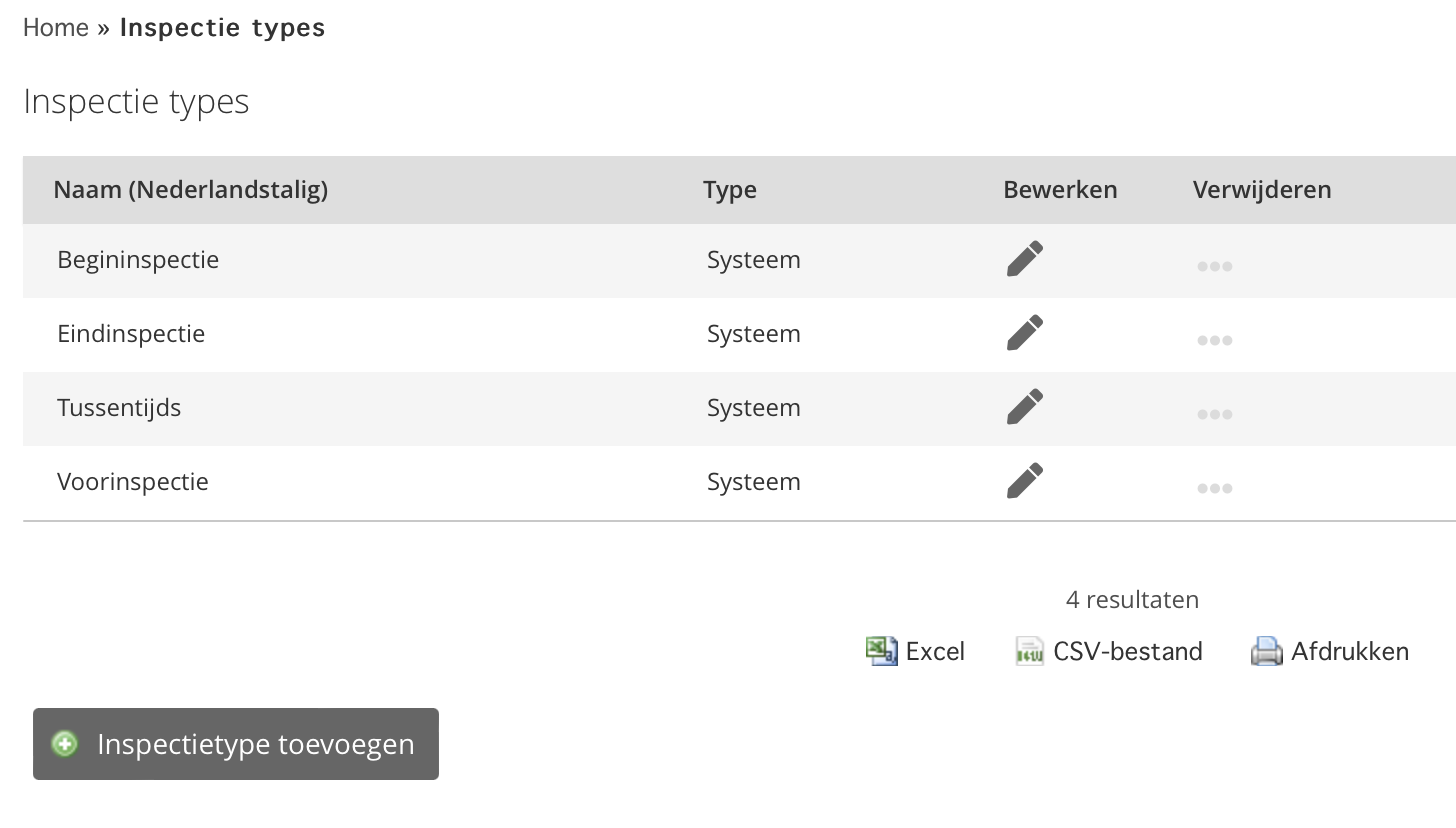 Standaard zijn er 4 typen inspecties aangemaakt.