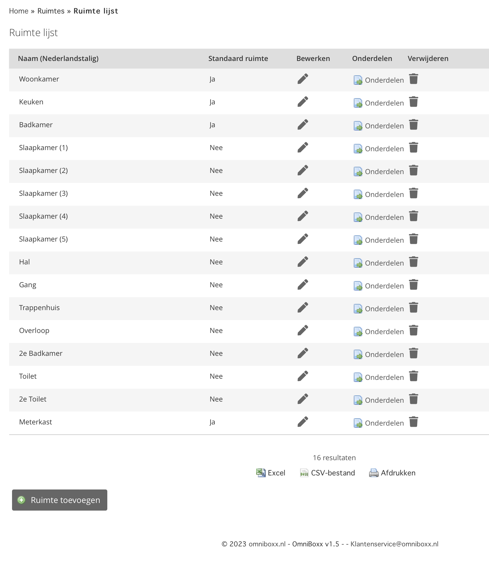 Ga voor het aanpassen of invoeren van ruimtes naar: “Instellingen -> Inspecties -> Ruimtes”
