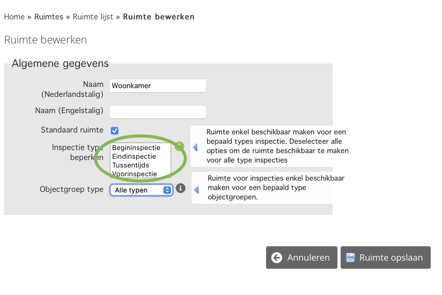 Standaard ruimte aangevinkt: deze staat standaard in de inspectielijst.