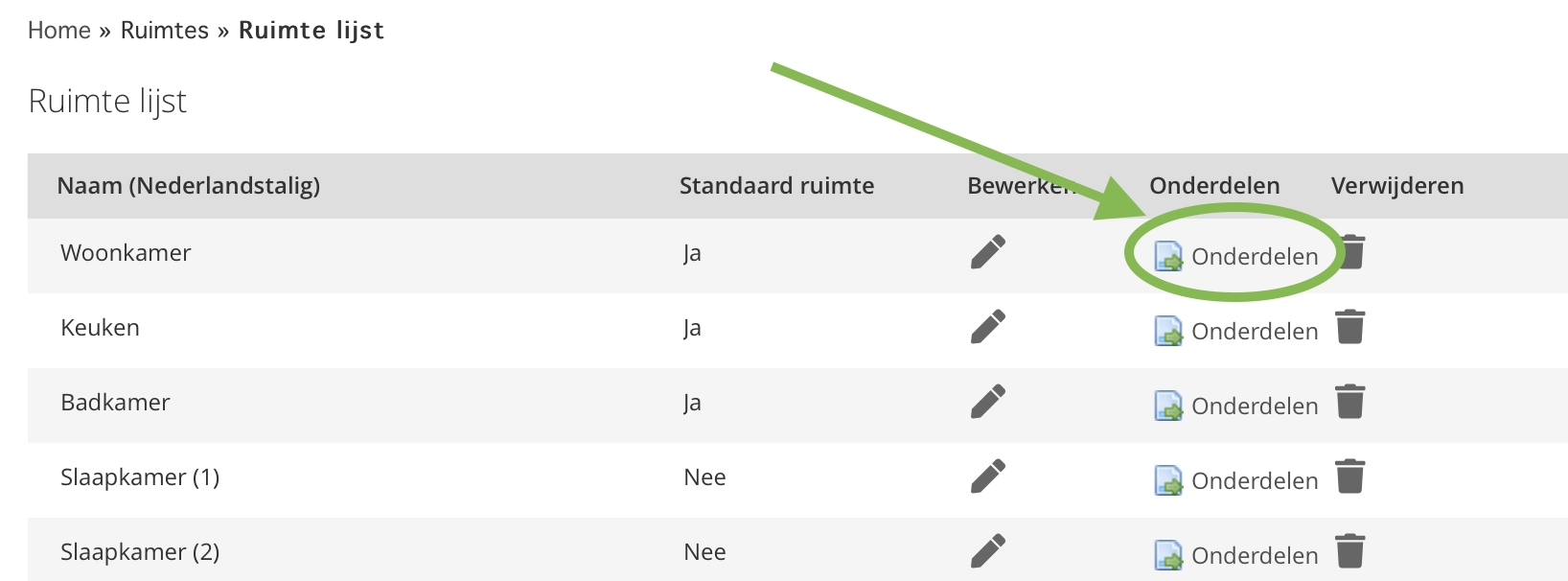 Klik hiervoor op het "onderdelen-icoon" in de "Ruimte lijst"