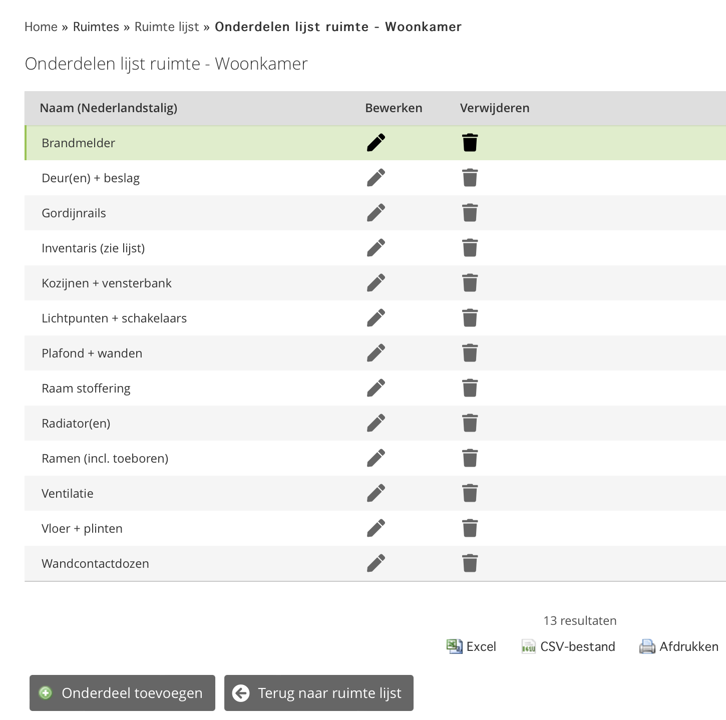 Dit is een lijst met ruimtes die bij een inspectie (kan) worden weergegeven in de inspectie app.