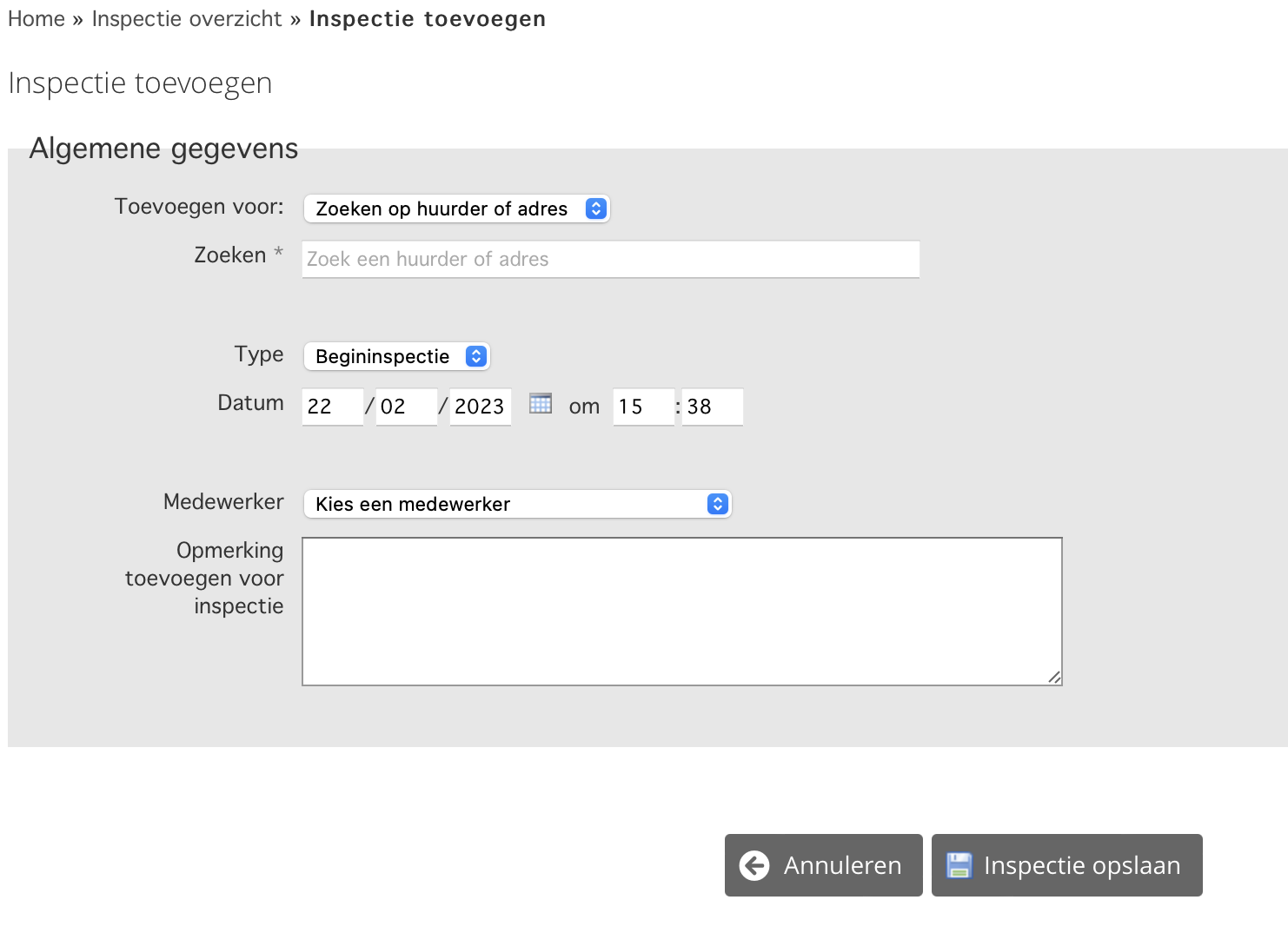 Of via: "Overzichten -> Inspecties -> inspectie toevoegen"