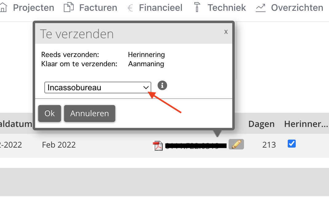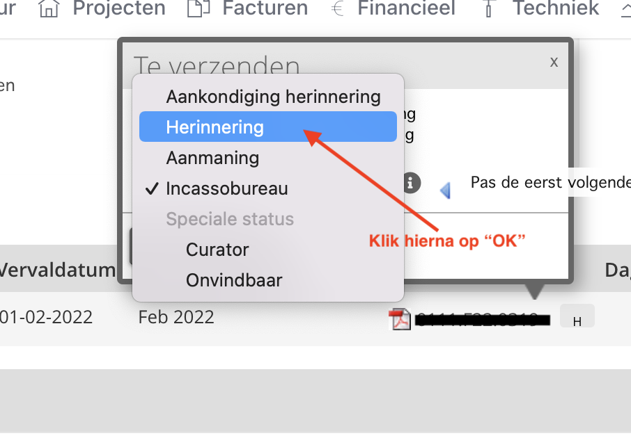Aansluitend zal de factuur weer als herinnering in het systeem staan en wordt er geen boete meegenomen.