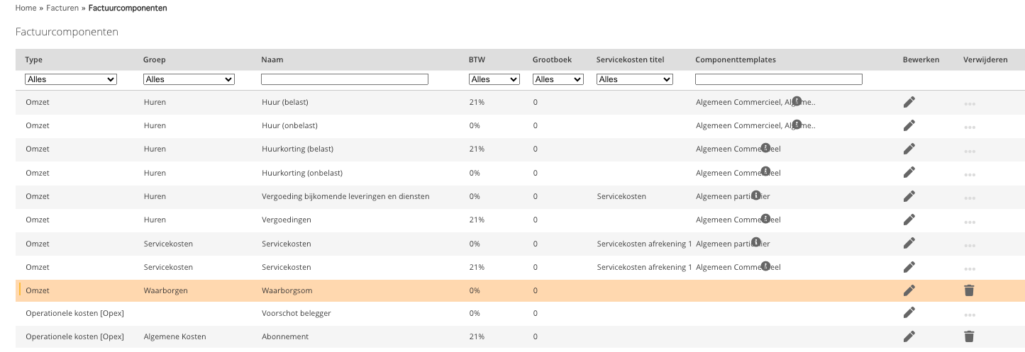 Huurcomponent: Hiermee wordt aangegeven of het component specifiek gaat over te incasseren huren (bijvoorbeeld Huur (belast), Huur (onbelast), Huurkorting, etc.)