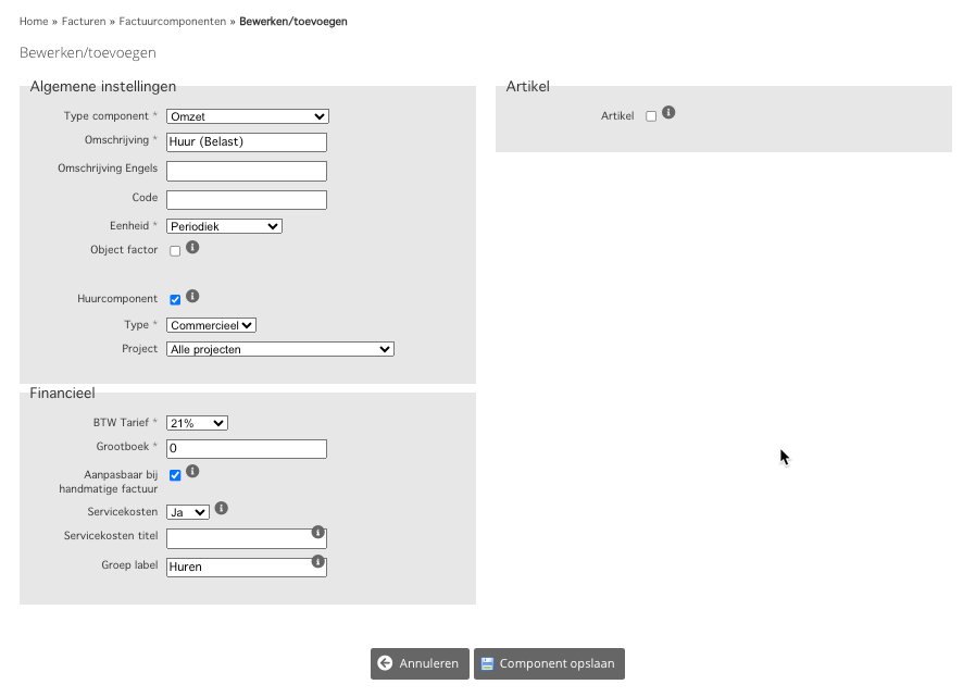 Servicekosten: Als het component voor servicekosten wordt gemaakt vink dit dan aan.