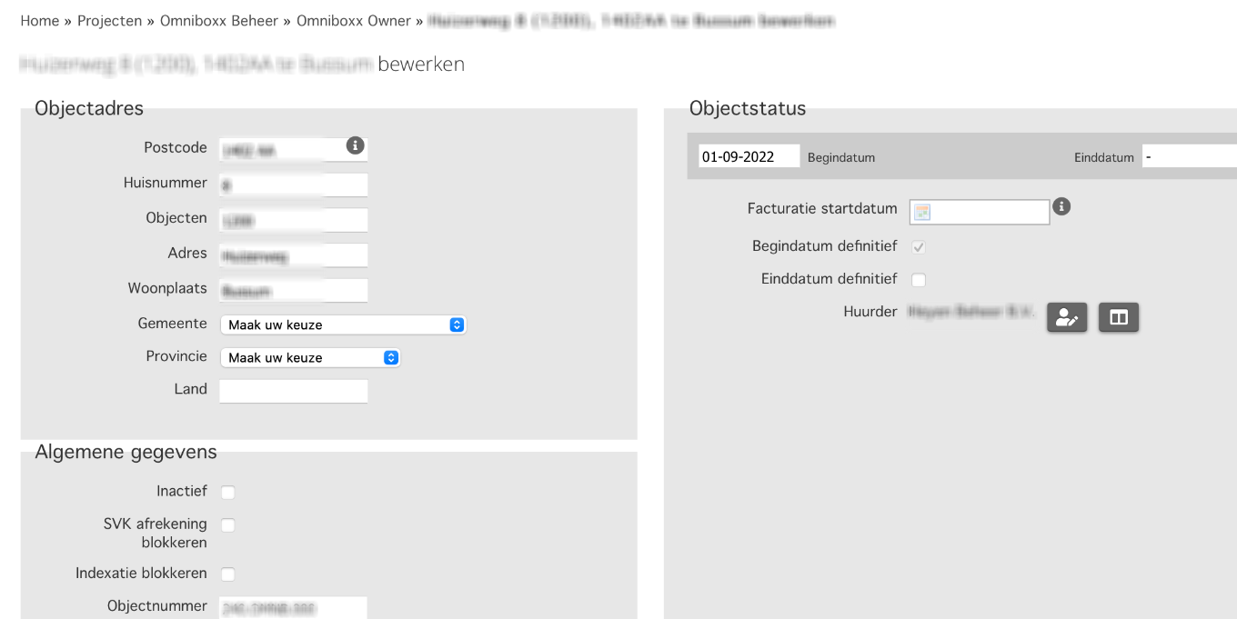 Inactief: Aanvinken indien het pand (nog) niet in gebruik is / (nog) niet in verhuur is. Het object is dan tevens uitgesloten van facturatie.