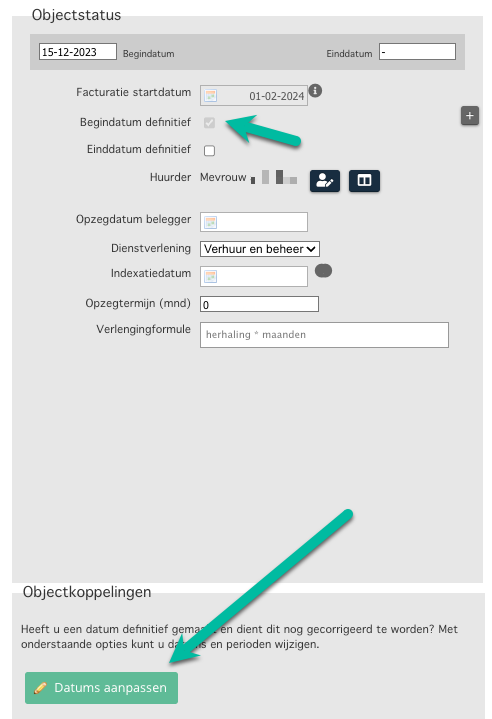 Wanneer een huurder gekoppeld is (of wordt) aan een object kan het voorkomen dat de (definitieve) begin datum niet correct is ingevoerd, of om andere redenen moet worden aangepast.