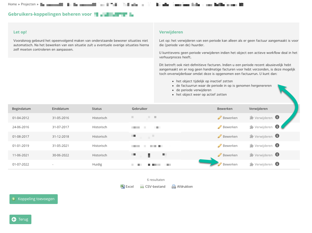 Het verwijderen van een kan alleen als er nog geen factuur voor de huurder is gemaakt. Rechtsboven aan de pagina staat toegelicht wanneer een periode niet verwijderd kan worden en welke opties er zijn om de periode alsnog te verwijderen.
