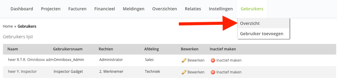 Welke rechten je hebt kun je zien in het gebruikersoverzicht, via “Gebruikers -> Overzicht".