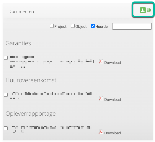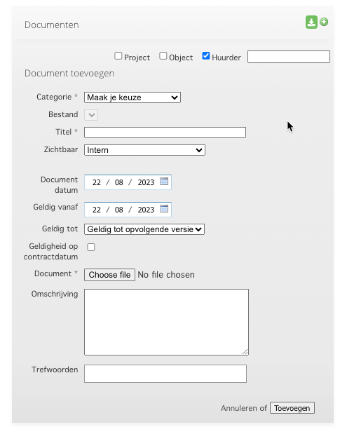 Checkboxen Project/Object/Huurder: Vink hier aan of het document ook op het object en/of het project moet worden toegevoegd.