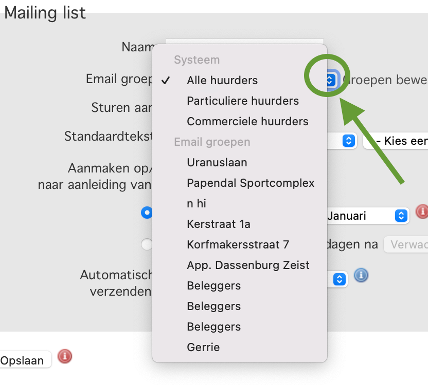 Emailgroep: Selecteer hier de groep voor wie de mailing bestemd is. (zie onderstaand voorbeeld)
