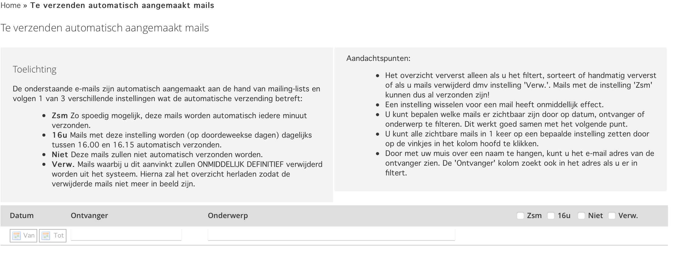 Overzicht "Te verzenden automatisch aangemaakte mails"