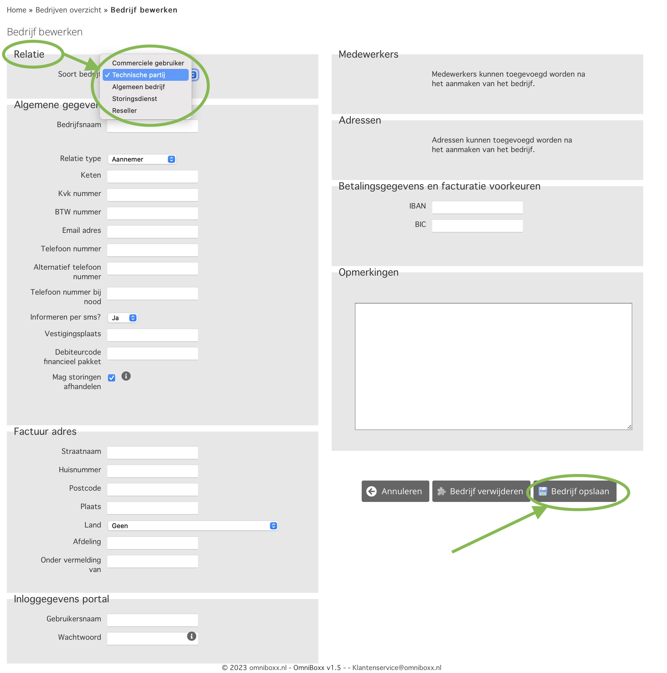Let op: Selecteer "Technische partij’ bij "Soort bedrijf" zodat je het juiste invoerveld te zien krijgt, dat wat bij een technische partij hoort.