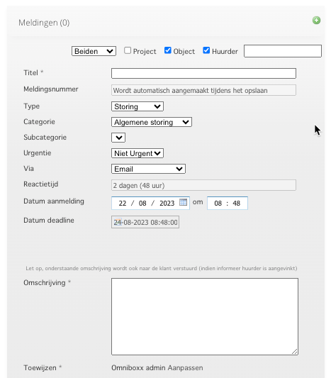Datum deadline: Dit veld vult automatisch op basis van de reactietijd zoals voor de geselecteerde categorie is bepaald onder "Instellingen -> Stamcategoriën -> Meldingcategoriën".