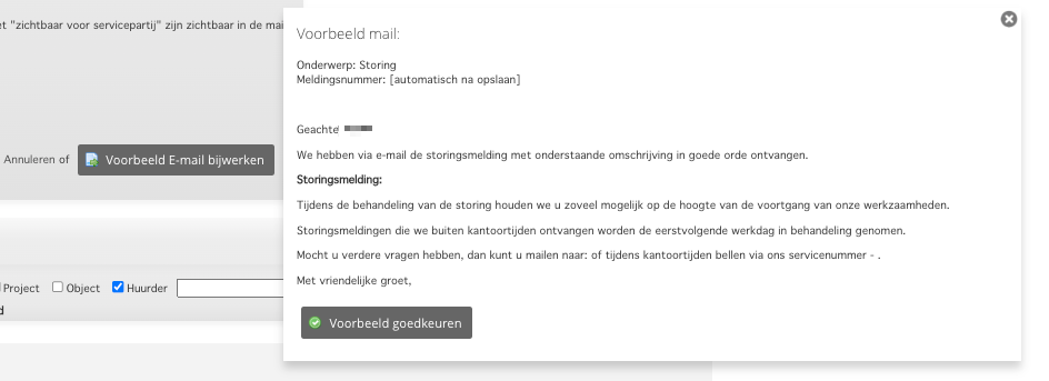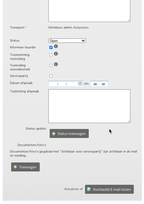 Vervolgens kan de melding geannuleerd worden via de button "Annuleren" of kan de voorbeeld e-mail naar de huurder worden ingezien en indien gewenst goedgekeurd ia de button "Voorbeeld e-mail inzien".