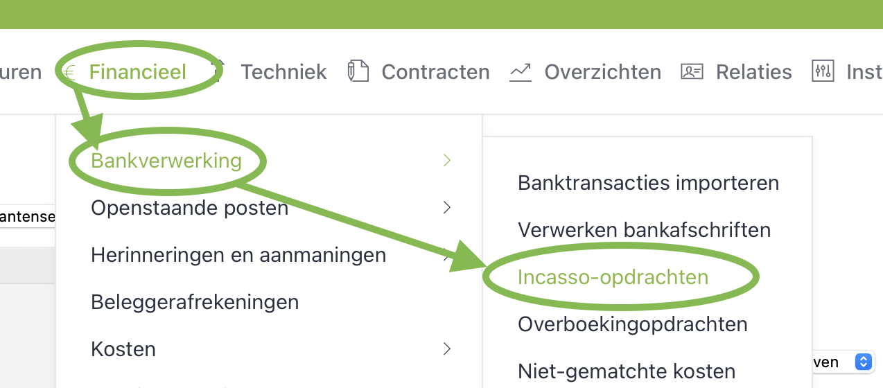 Deze bestanden vindt u via: “Financieel ->Bankverwerking -> Incasso-opdrachten”