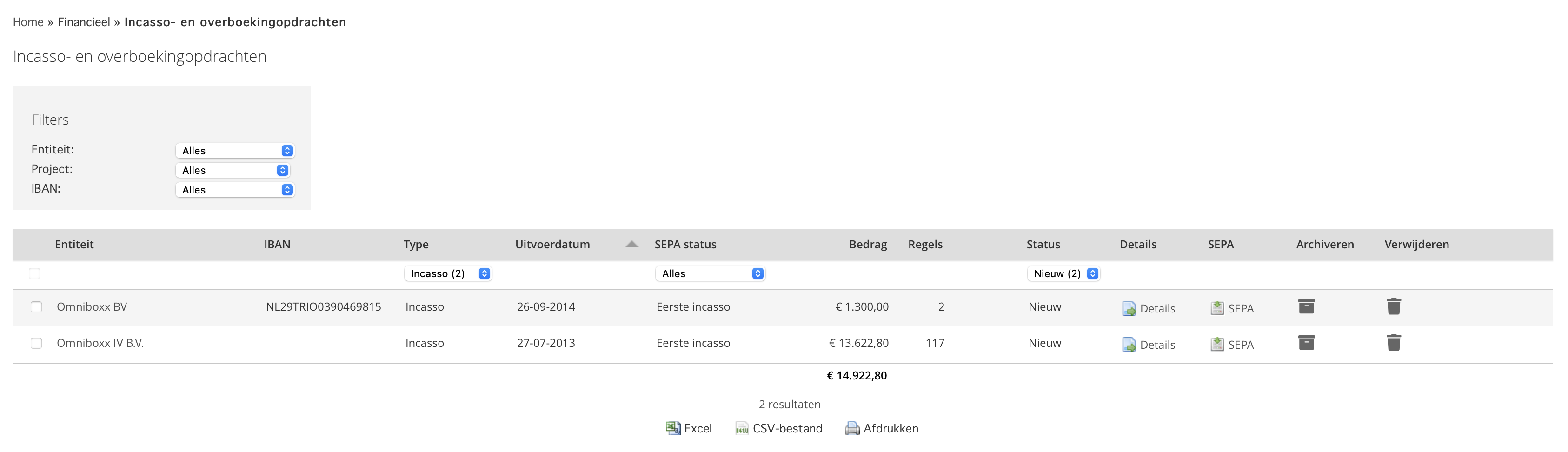De "Incasso- en overboeking opdrachten" lijst wordt geopend.