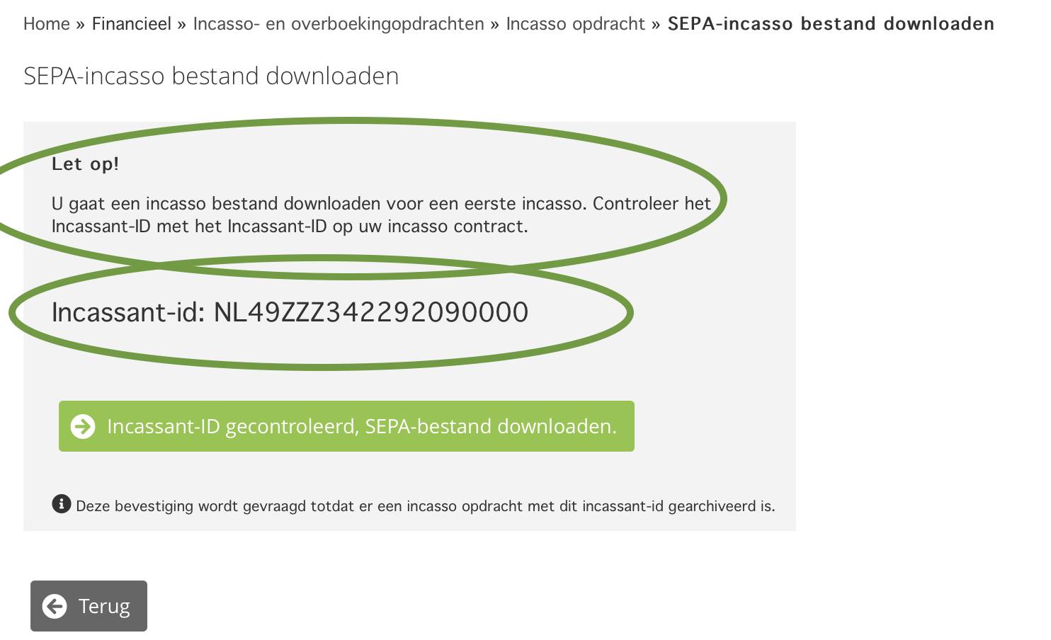 Let op: Voer de gevraagde controle uit en klik aansluitend op "Incassant-ID gecontroleerd, SEPA-bestand downloaden".