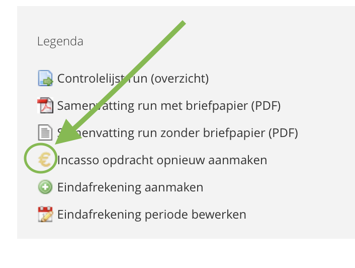 Via het menu "Facturen -> Verzonden runs" kan per regel een nieuwe incasso opdracht aangemaakt worden door het euro-teken te selecteren bij de betreffende run.