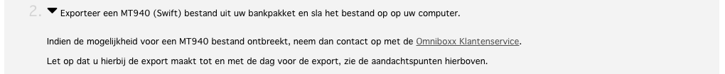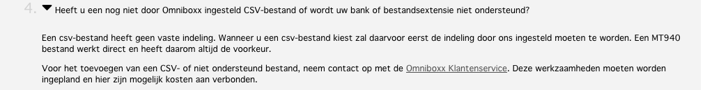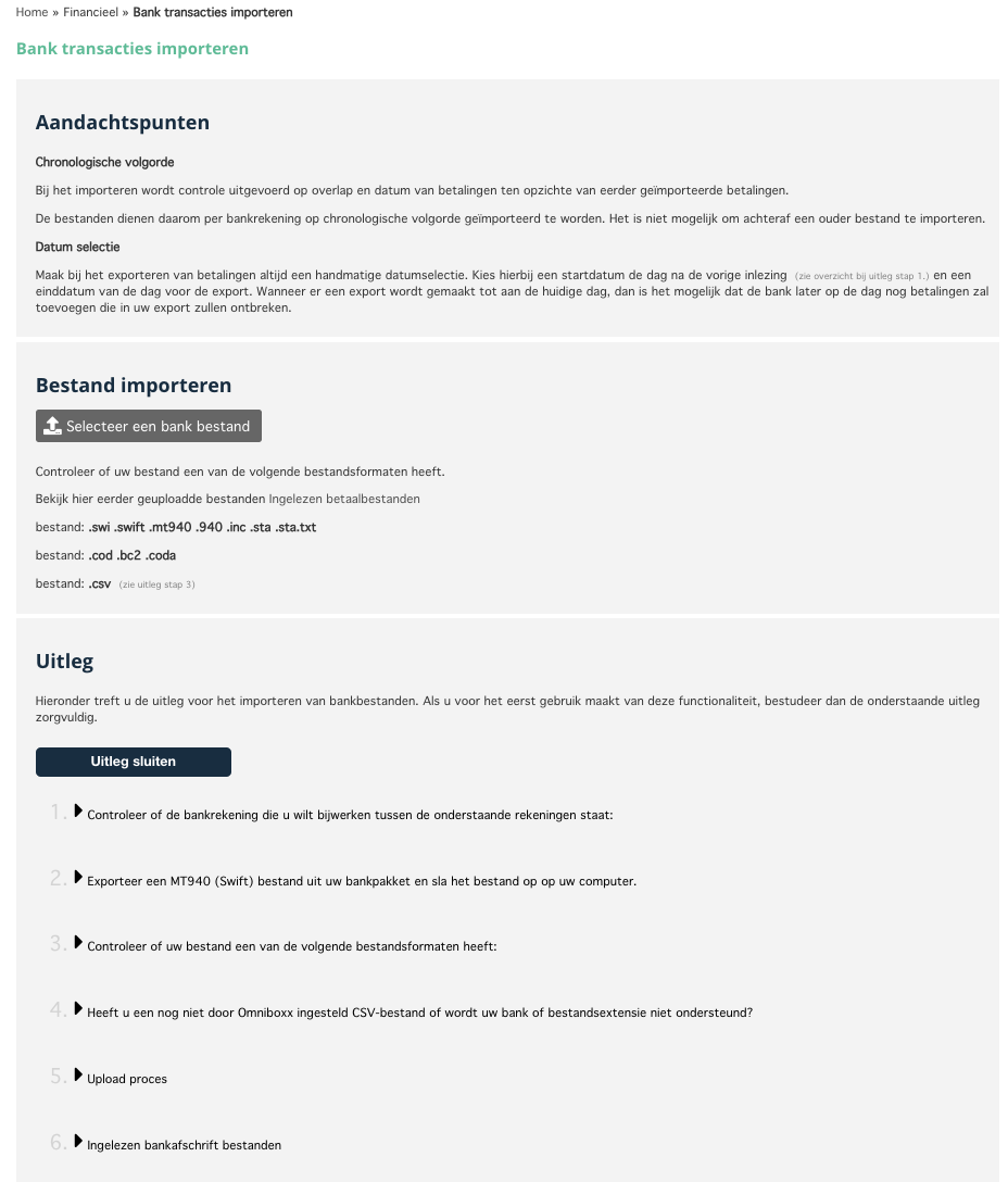 | Let op: Wanneer er niet zorgvuldig met de chronologische volgorde en/of datumselectie van de bankbestanden die geïmporteerd worden in Omniboxx wordt omgegaan is het een reëel risico dat banktransacties zullen ontbreken in Omniboxx! |