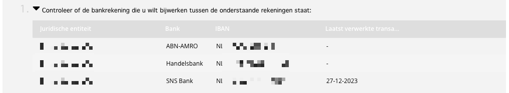 Onder stap 1 kan gecontroleerd worden of het bankrekening nummer van de betreffende juridische entiteit waarvoor een bestand moet worden geimporteerd al bekend is in Omniboxx en wanneer de laatste import van de rekening is geweest.