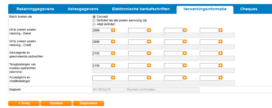 Via "algemeen, administratie en kassen & banken" is het mogelijk de grootboekrekening voor terugboekingen van incasso-opdrachten (storno’s) en geweigerde betaalopdrachten in te stellen.