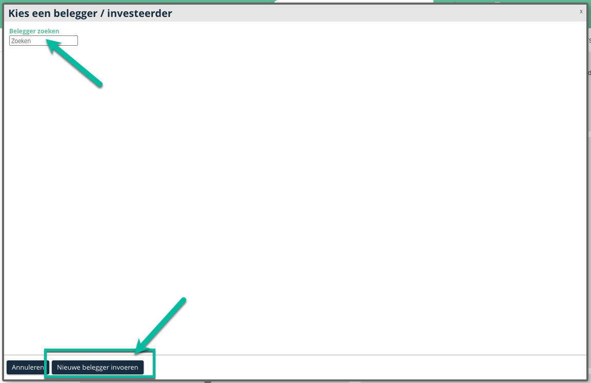 Door te klikken in het veld "belegger" opent het volgende scherm, waarin een bestaande belegger gezocht (en gekoppeld) kan worden of een nieuwe belegger kan worden aangemaakt.