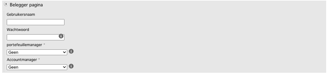 Accountmanager: Hier kan een gebruiker van het systeem als accountmanager worden geselecteerd. Indien er een gebruiker is geselecteerd zullen de contractgegevens van de accountmanager in de portal van de belegger worden getoond.