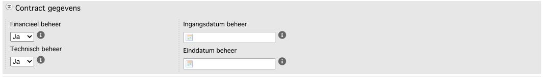Technisch beheer: Selecteer hier "Ja" om aan te geven dat er volgens contract technisch beheer op de objecten wordt gemanaged, zoals onderhoud, storingen, klachten, etc.