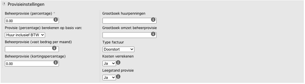 Leegstand provisie: Indien "Ja" wordt geselecteerd wordt de vaste provisie, zoals ingesteld bij de beleggerinstellingen, berekend voor de objecten waarbij in de betreffende periode geen facturen (ivm leegstand) naar een huurder verstuurd zijn.