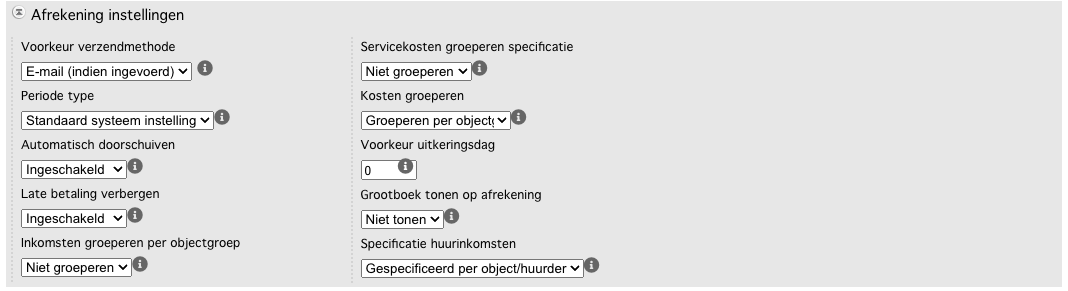 Voorkeur verzendmethode: Selecteer hier de gewenste verzendmethode voor de afrekeningen, via email of klaarzetten voor postverzending. Voor beide opties geldt dat de benodigde gegevens moeten zijn ingevoerd.
