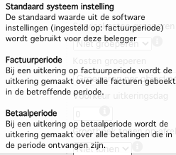 Let op: De ingevoerde data (begin en eind) zijn van belang voor het genereren van beleggerafrekeningen voor de belegger. Bij het maken van facturen die op de afrekening moeten komen te staan moet hier rekening mee gehouden worden. Facturen die buiten dit "tijdsvenster" vallen zullen niet worden opgenomen op de afrekeningen.