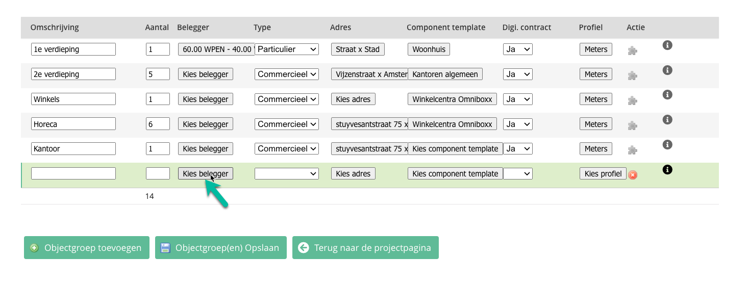 Het aanmaken van een belegger gaat via een object of een objectgroep.