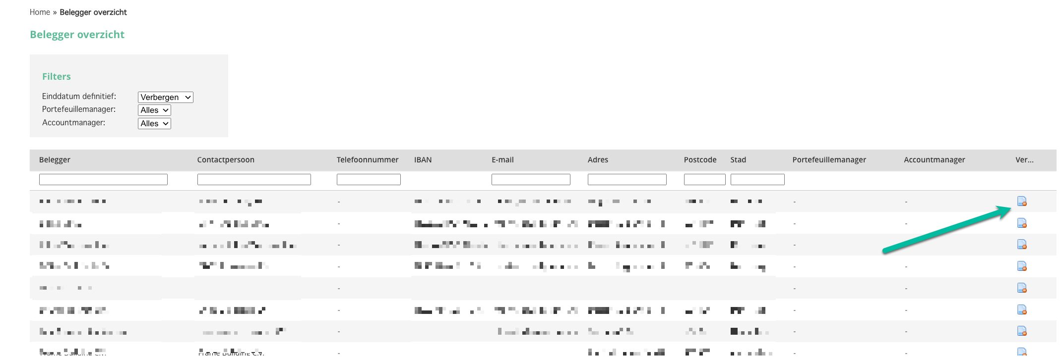 In het overzicht staat in de laatste kolom "verwijder-icoon" waarmee de belegger verwijderd kan worden .