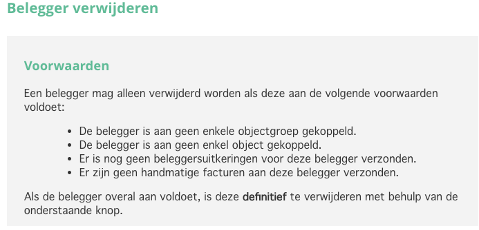 Selecteer alleen "Definitief verwijderen" er écht zekerheid is over de keuze de belegger te verwijderen.