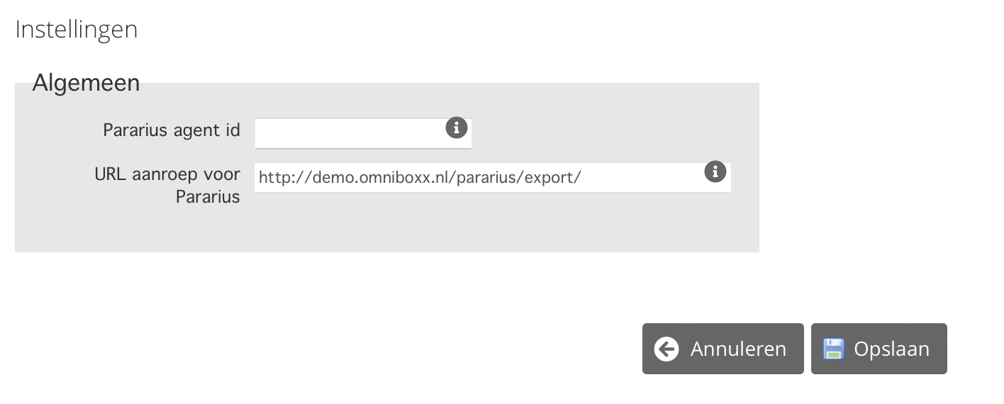 De Pararius agent ID zal in de Pararius omgeving zelf eerst moeten worden opgezocht en hier worden ingevuld voordat de koppeling zal werken.