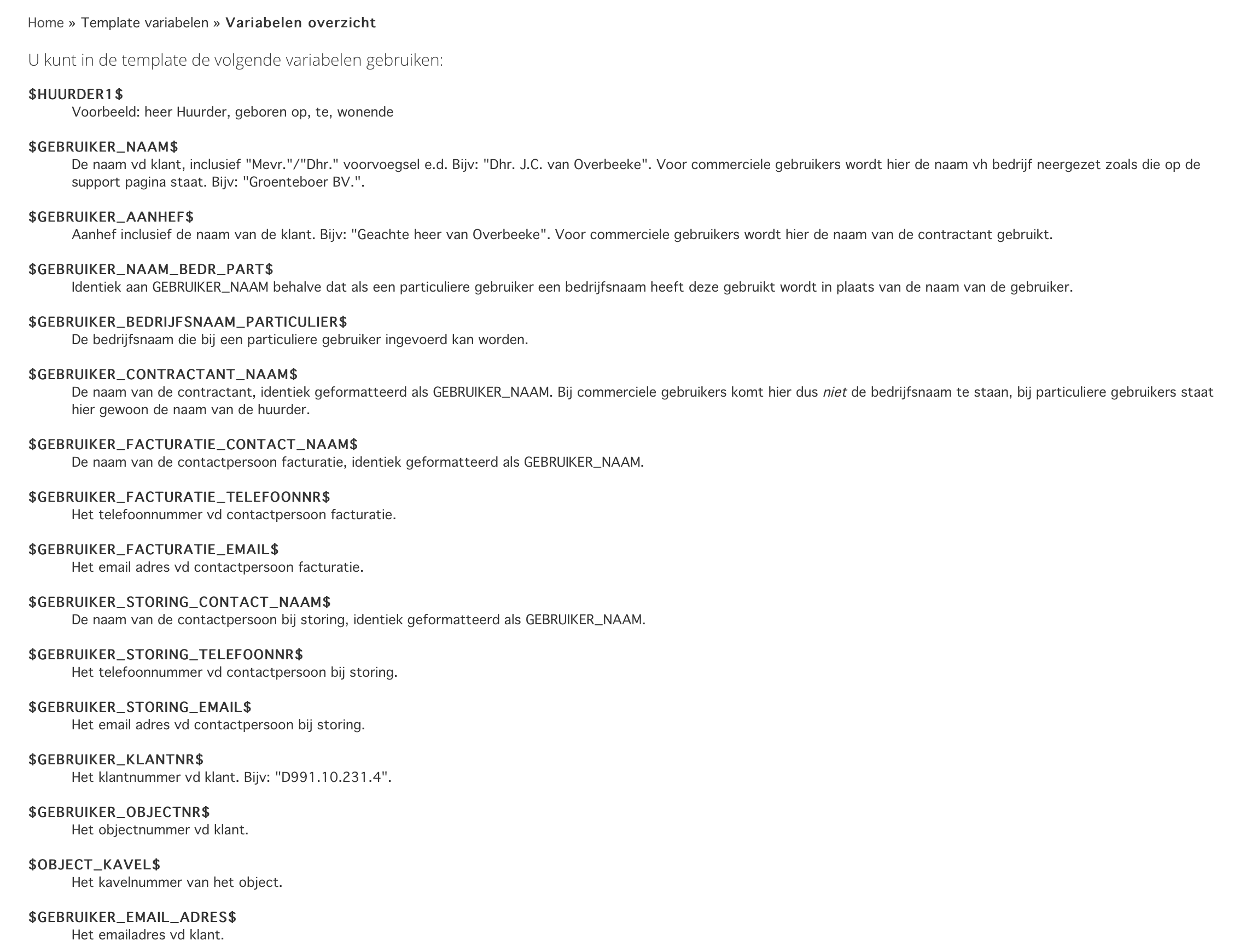 Als u op een bepaalde plek een variabel gegeven in wilt laten vullen (zoals een naam, adres, postcode, etc.) doet u dat door een zogenaamde "template variabele" in te geven.