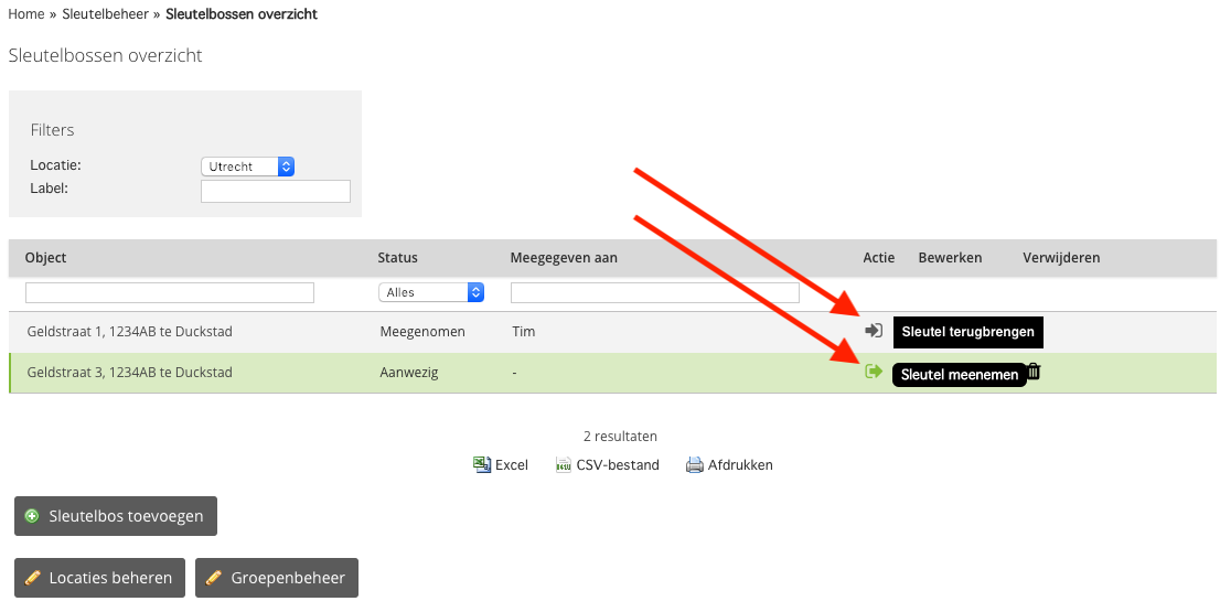 Klik in het hoofdmenu bij "Acties" op “Sleutel terugbrengen” bij een eerder "Uitgecheckte sleutel"